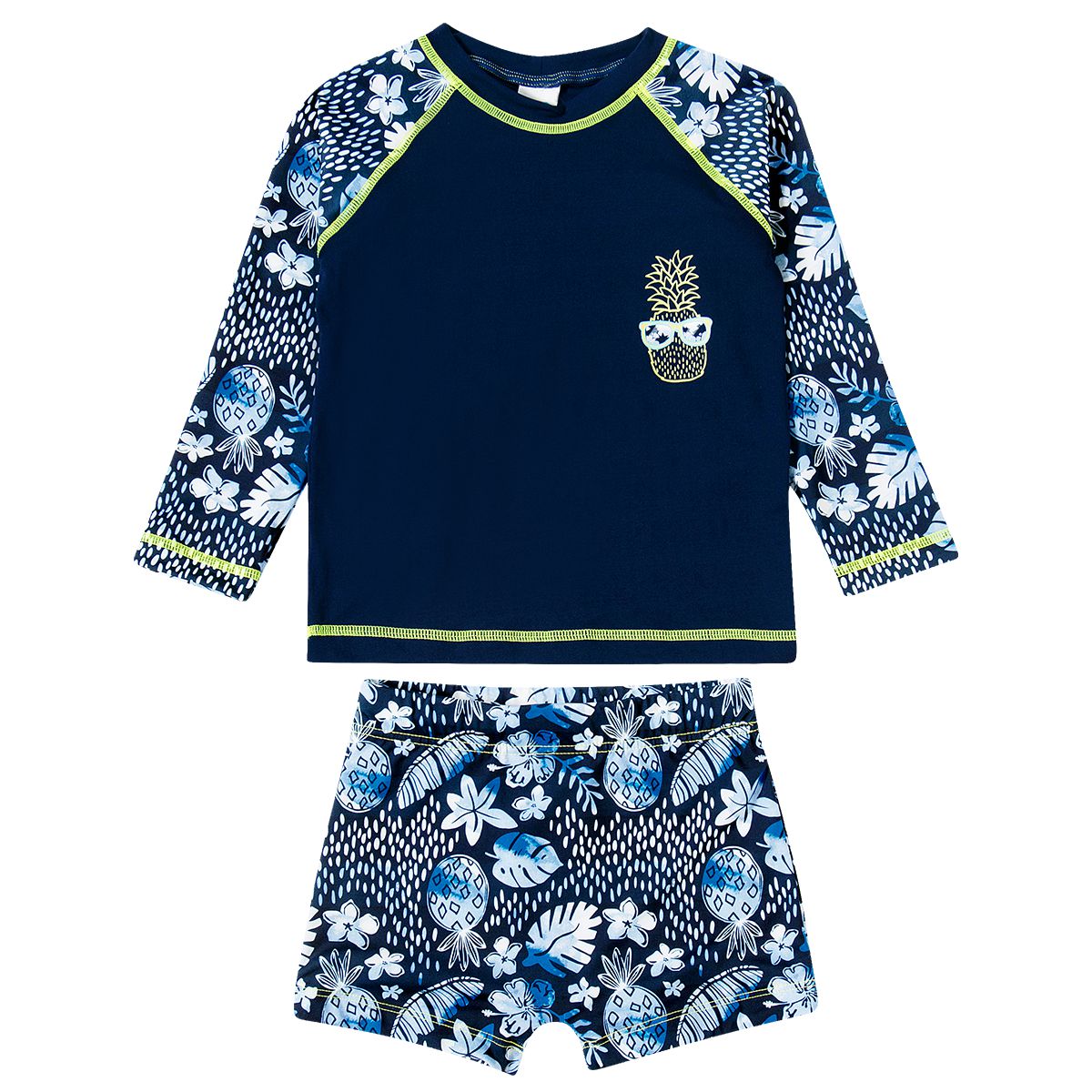 Esta moda praia com fator de proteção UV50+ contém duas peças ideais para o seu pequeno, camiseta e bermuda com cores super fofas de fusca.