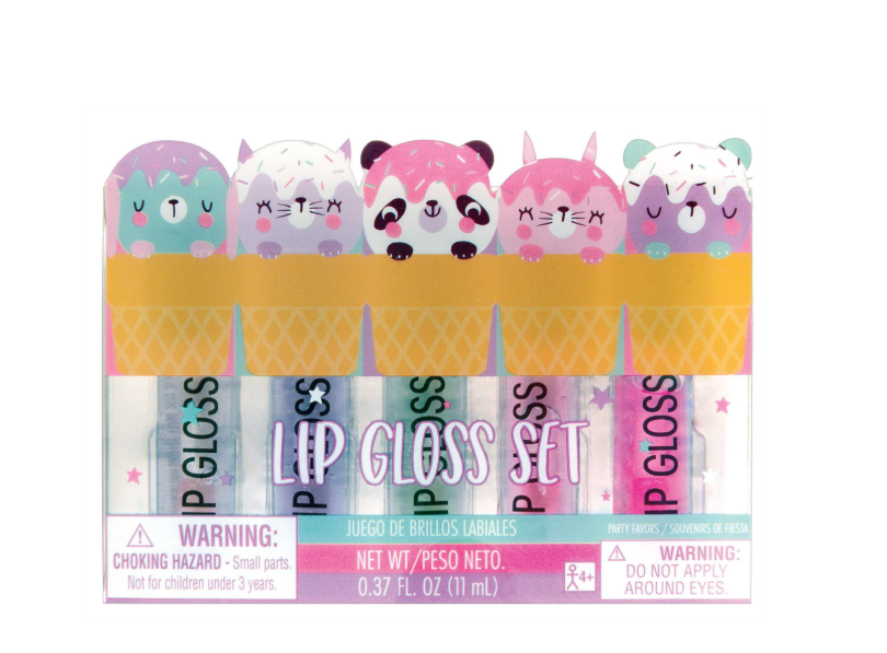 é um conjunto de brilhos labiais da marca Amscan, com embalagem temática de animais fofos. O conjunto é vendido como lembrancinha de festa de aniversário e vem com cinco brilhos labiais com glitter nas cores roxo, rosa claro, azul, rosa e transparente, com aromas de uva, morango e mirtilo