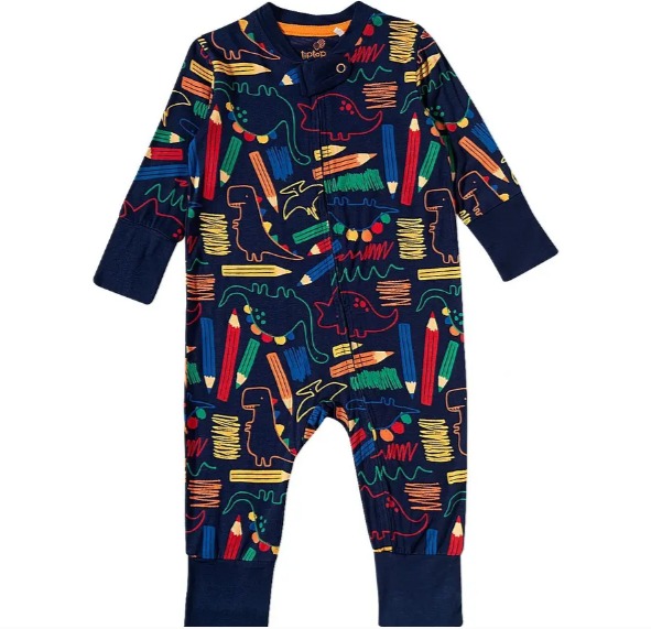 O Pijama macacão bebê dino rabisco malha com elastano tip top é confeccionado em malha com elastano macio e confortável.