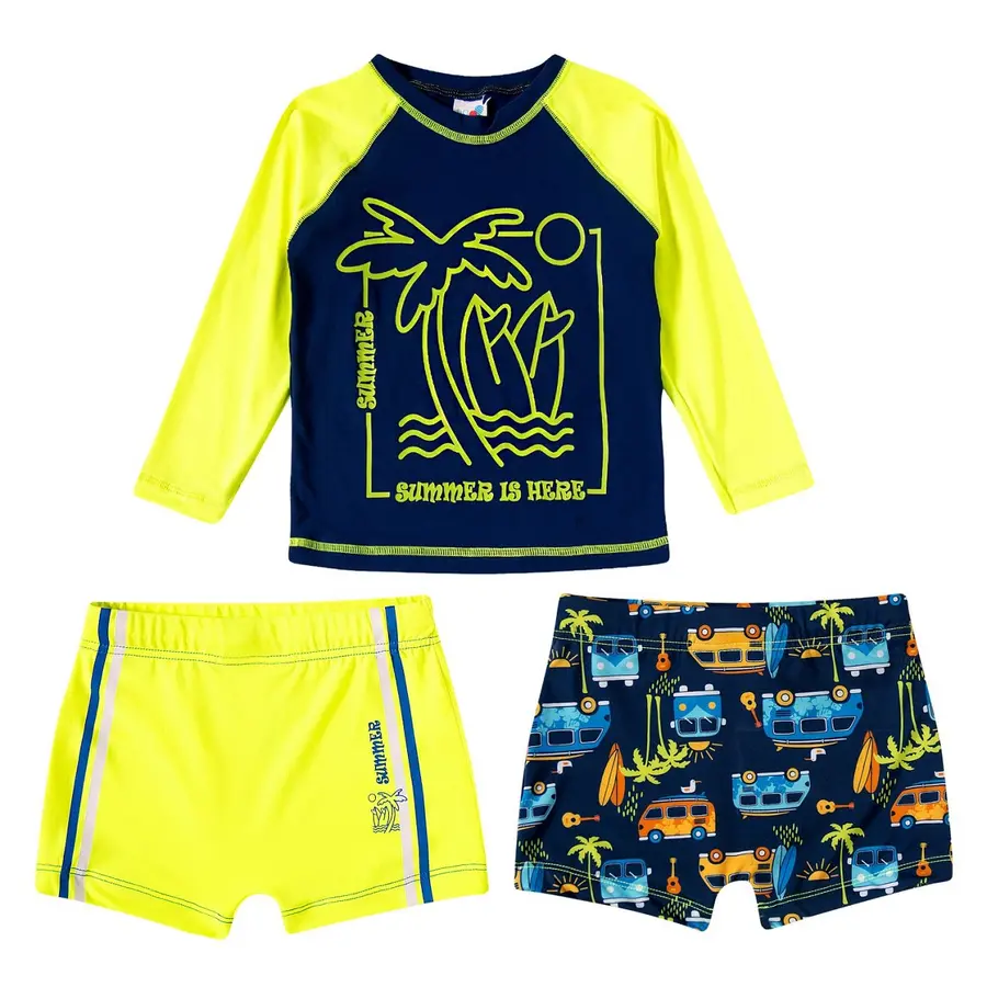 Esta moda praia com fator de proteção UV50+ contém duas peças ideais para o seu pequeno, camiseta e bermuda com cores super fofas de coqueiro.