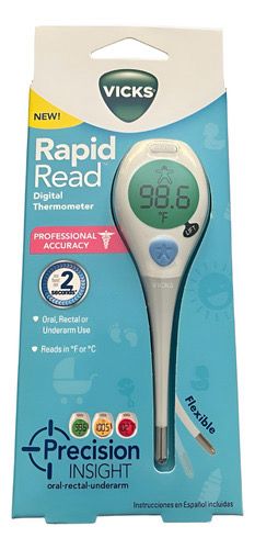 Vicks termômetro digital de leitura rápida oferece leituras precisas em apenas 2 segundos. O recurso Fever InSight facilita a obtenção e interpretação das leituras de temperatura com um visor codificado por cores: um display verde indica uma temperatura normal, amarelo sinaliza uma temperatura elevada e vermelho indica uma temperatura alta.