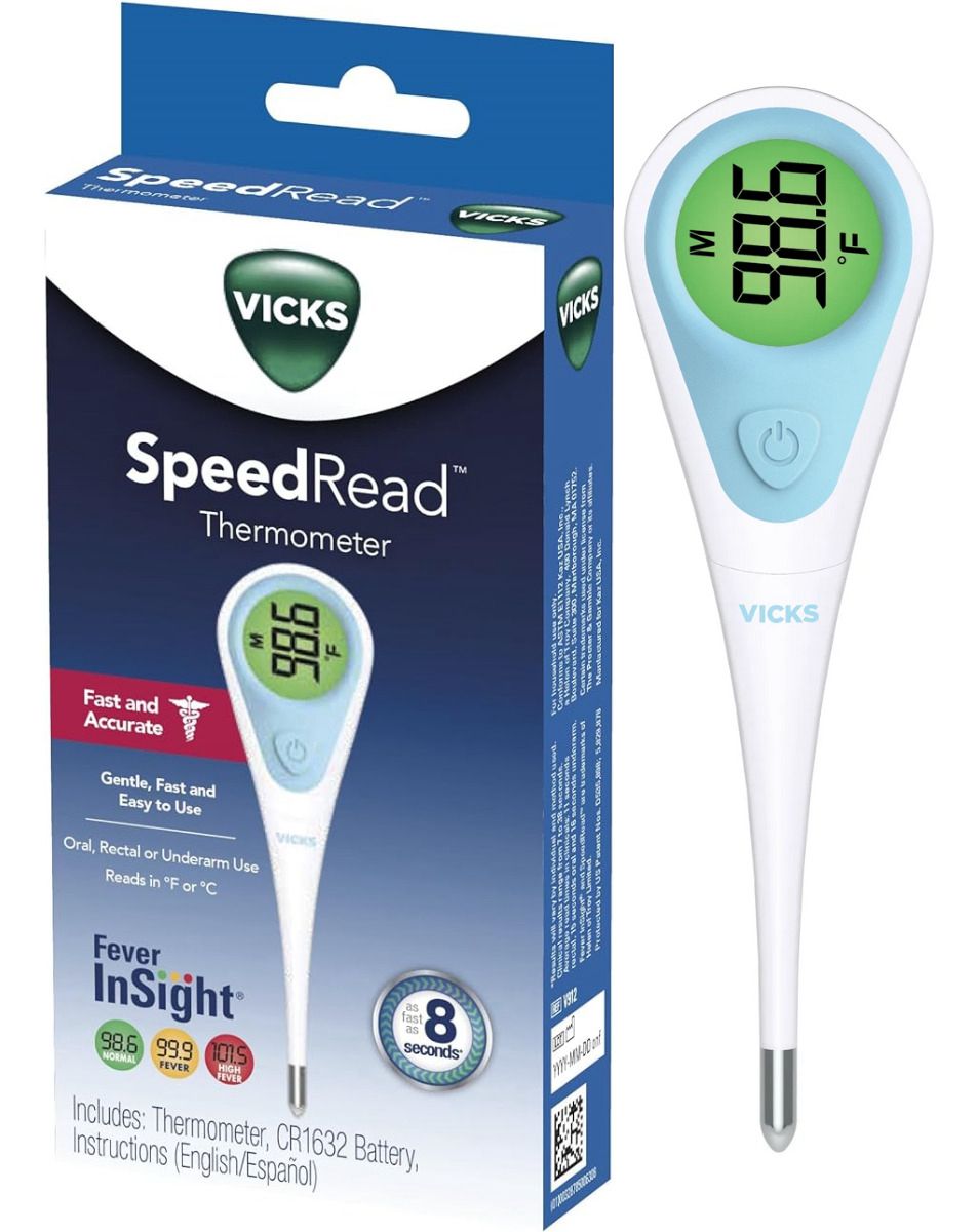 Vicks termômetro digital de leitura rápida oferece leituras precisas em apenas 8 segundos. O recurso Fever InSight facilita a obtenção e interpretação das leituras de temperatura com um visor codificado por cores: um display verde indica uma temperatura normal, amarelo sinaliza uma temperatura elevada e vermelho indica uma temperatura alta.