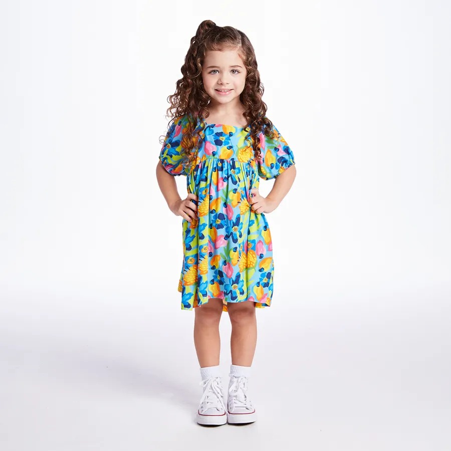 O Vestido Tiptop contém uma peça ideal para a sua pequena, um vestidinho com fundo azul e a estampa de caju bem divertida.